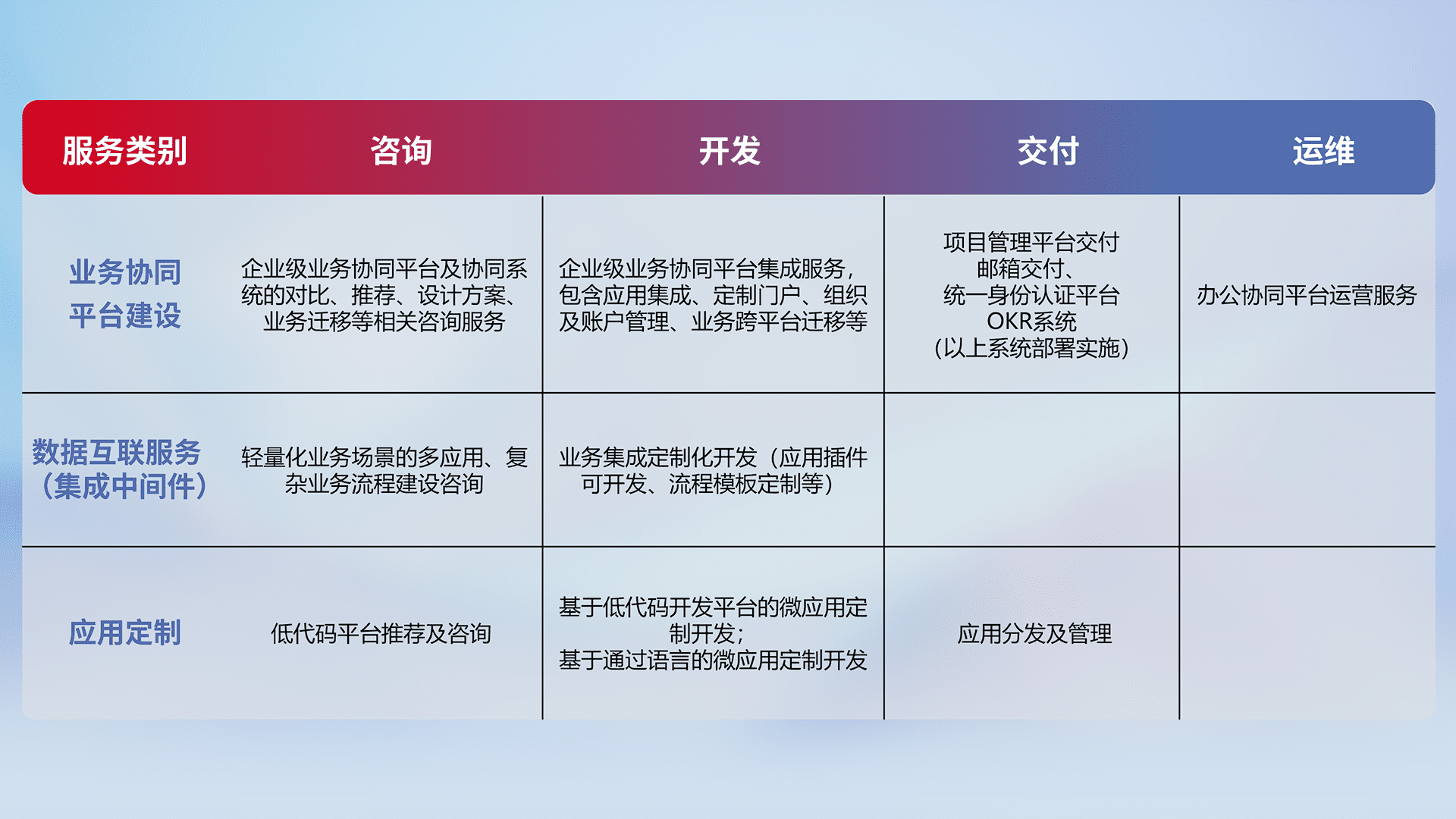 针对钉钉、、企微、、、、IDaas等平台级产品提供产品的规划、、、方案、、、、交付、、、、定制化开发等服务,,实现如统一协同办公、、、智能客户服务、、、、混合会议管理、、、智能数据查询、、等业务场景,,实现数字化转型。。。。