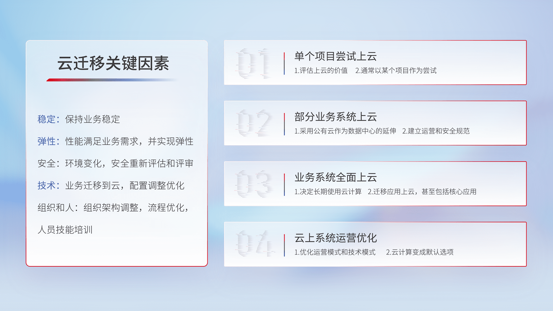 结合实际业务,,从规划设计、、云平台选型、、、、云原生改造、、、、数据迁移、、、、集成交付,,,,迁移全过程为客户识别最佳上云路径,,,做好风险识别管理,,,,设计网络架构、、、、身份权限、、安全审计合规、、、操作审计、、、、日志审计、、监控告警策略、、、、多站点容灾设计等,,对云上基础设施进行整体规划,,,提升IT治理水平,,,,以满足弹性、、、、高可用、、、高性能的需求。。。。