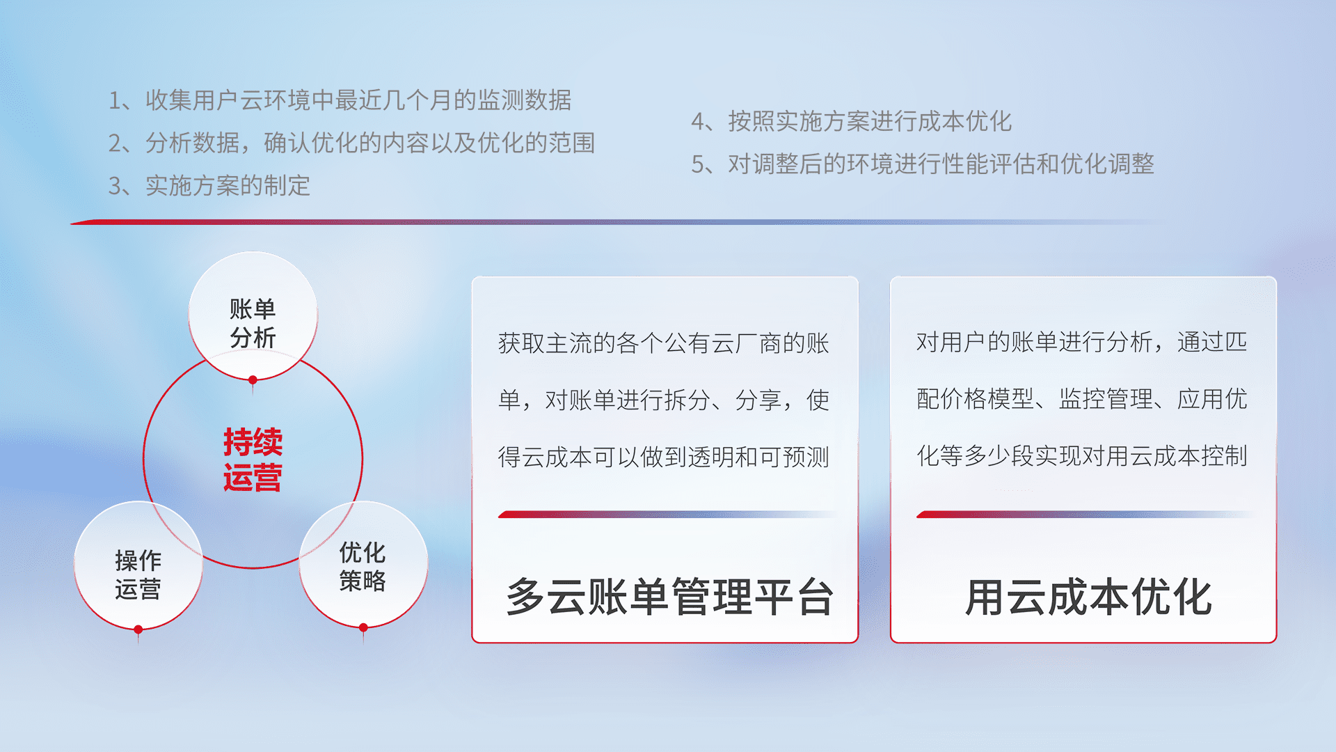 通过多云纳管,,,以统一的资源数据模型把客户的云资源进行抽象和封装,,,进而实现对多云资源的统一操作,,,,保障云资源管理的可靠性、、、稳定性与可用性。。。。量身定制化运维内容,,配置、、、开发运维、、、补丁管理、、、备份、、、、监控、、认证和访问管理、、、、审计和日常巡检等,,保障在用云过程中的可靠度,,稳定度以及高可用率。。