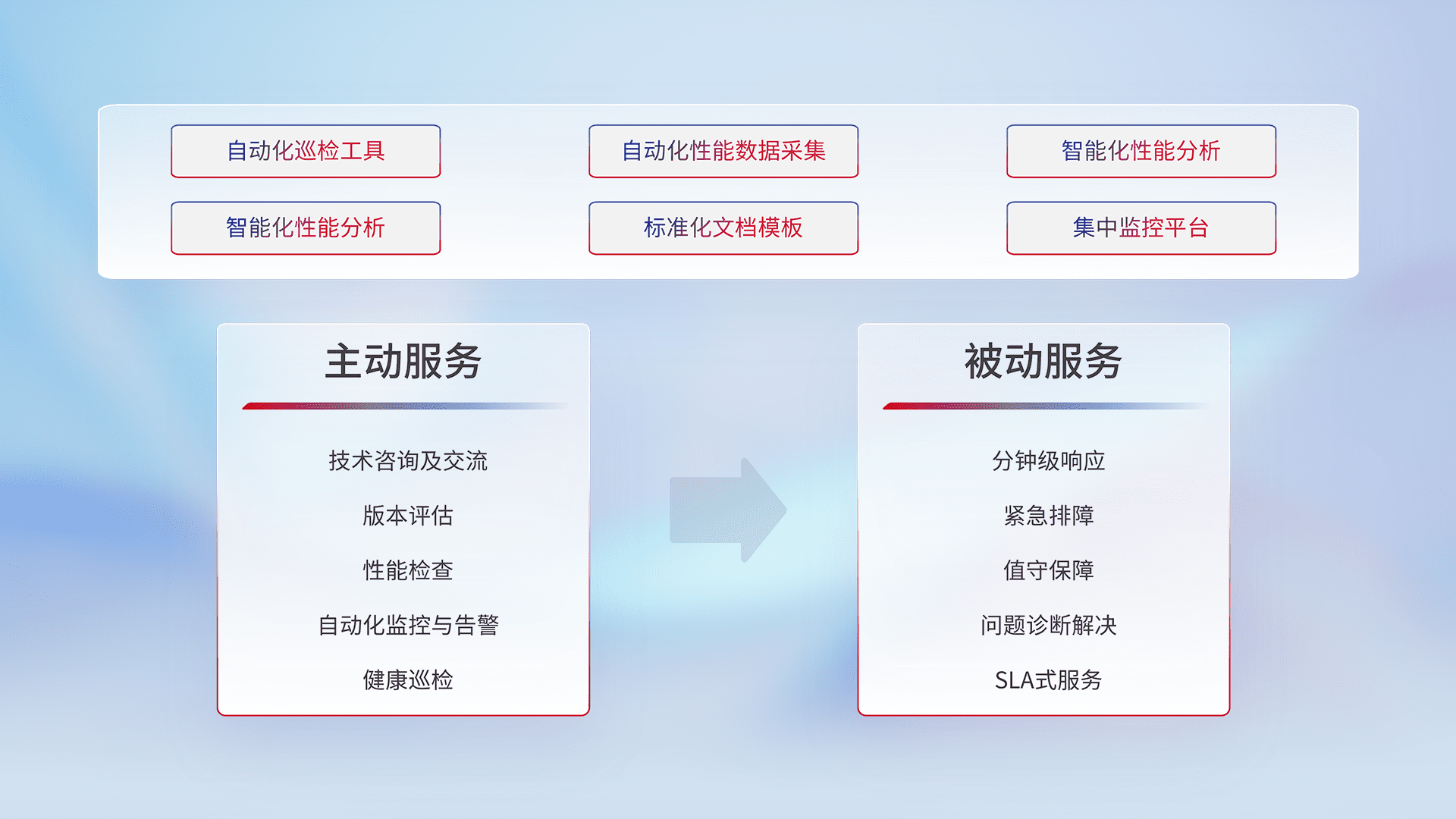 智能化工具和标准化文档,,,保障服务质量,,,提供主动服务(包含技术咨询、、、、版本评估、、性能检查、、自动化监控与告警、、、、健康巡检)和被动服务包含(分钟级响应、、紧急排障、、、值守保障、、、、问题诊断解决、、SLA服务)。。。。